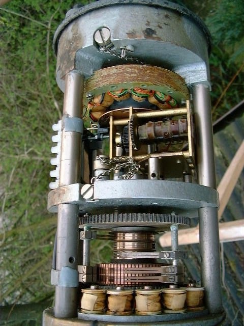 1960er Jahren. Oben der Generator für die Windgeschwindigkeitsmessung, darunter rechts das Zählwerk für die mittlere Windgeschwindigkeit und ganz unten der Geber für die Windrichtung (Drehfeld). Nach Einbau einer Lochscheibe mit Gabellichtschranke (unter dem Generator) können Messwerte der Windgeschwindgkeit auch digital verarbeitet werden. Die Achse der Windfahne konnte nicht durch den Generator geführt werden und musste, (leider hier nicht sichtbar) nach hinten versetzt, über ein Gestänge in das große Zahnrad greifen. Detail der Konstruktion: die Schrauben sind mit Ketten gesichert, damit sie bei der Montage auf dem Mast nicht verloren gehen. Gesamtgewicht ca.13 kg ! So viel Mechanik hatte