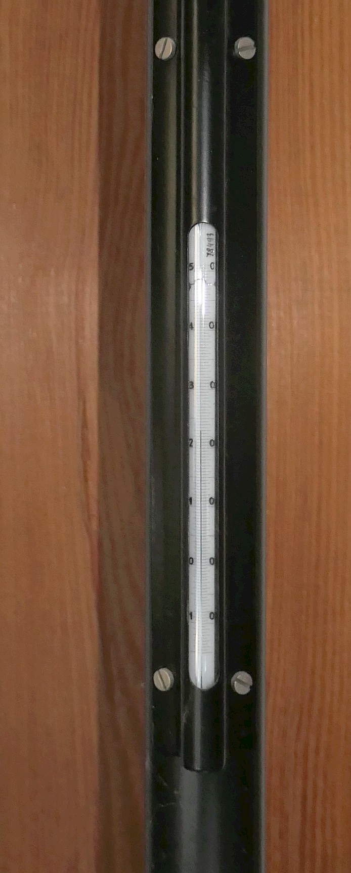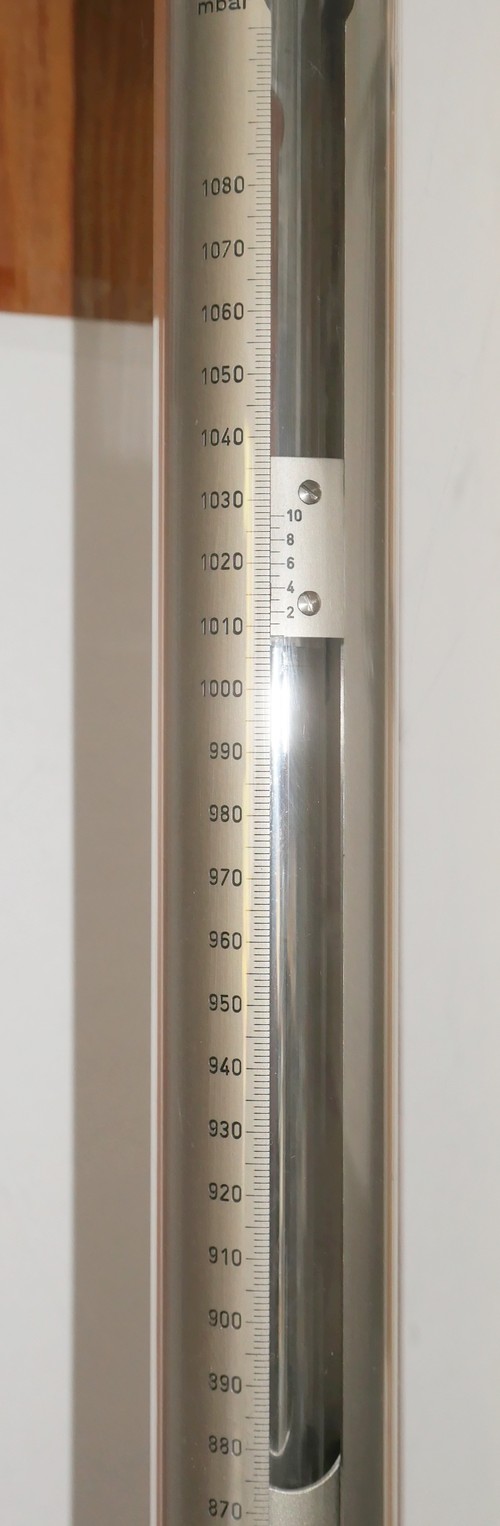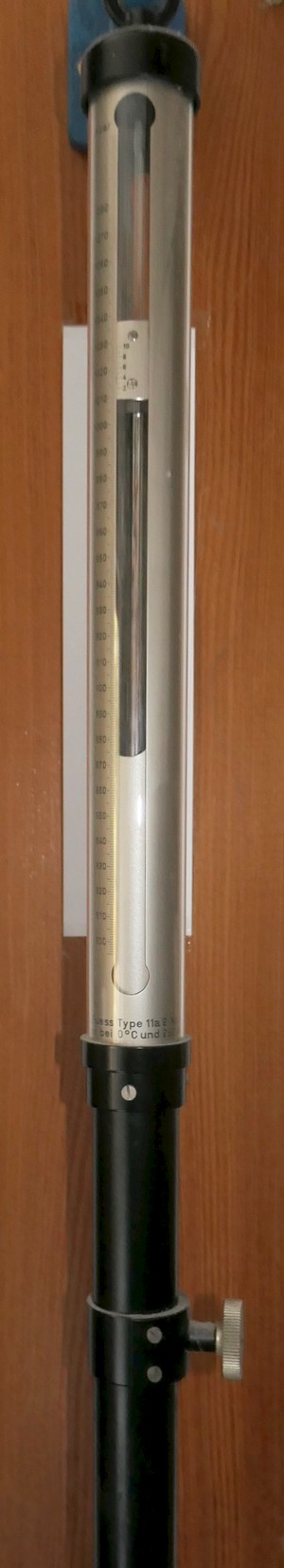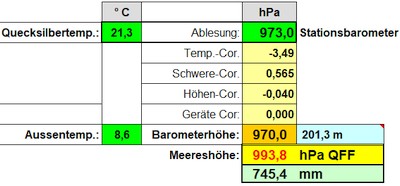 Quecksilber Stationsbarometer zur genauen Bestimmung des Luftdrucks auf Ortshöhe. Dazu sind verschiedene Korrekturen anzuwenden. 1. die Temperaturkorrektion mit Hilfe des Thermometers 2. die Schwerekorrektion in Abhängigkeit von der geographischen Breite, 3. die Höhenkorrektion über NN, 4. die Gerätekorrektion Dieser berechnete Wert kann mit der Barometrischen Höhenformel unter Berücksichtigung der Außentemperatur auf Meereshöhe umgerechnet werden. Beispiel für eine Stationshöhe von 201,3m: ![]() |