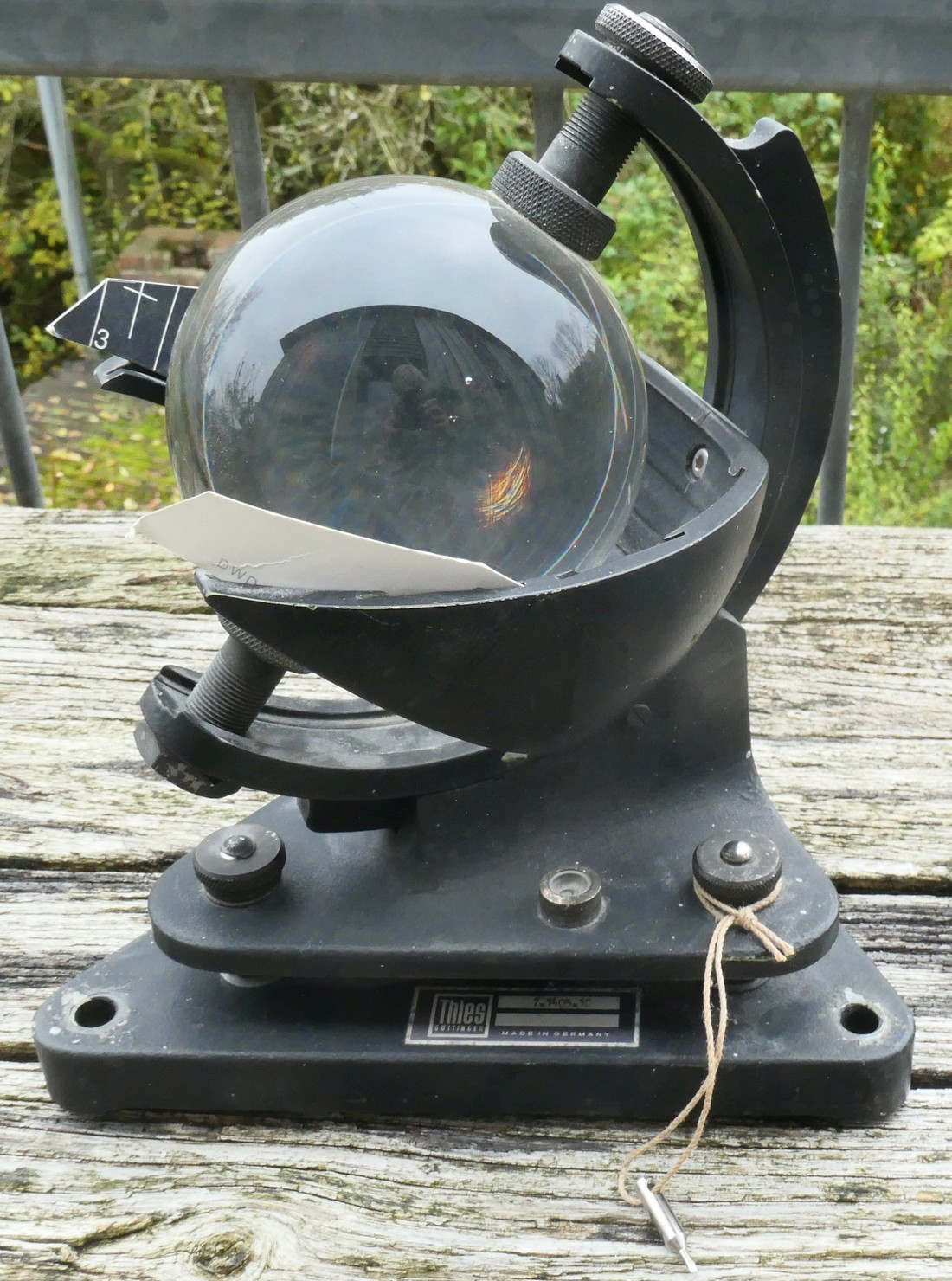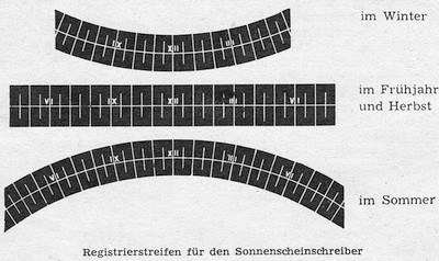 Sonnenscheinschreiber nach Campbell-Stokes Der Schreiber besteht aus einer massiven Glaskugel mit einem Durchmesser von ca. 96 mm. Der Brennpunkt liegt in einer metallenen Kugelschalenzone, in die ein schwarzer Papierstreifen eingeschoben wird. Im Fokus der Glaskugel wird bei Sonnenschein eine Strichspur in den Streifen eingebrannt. Die Achse muss in der Höhe auf die jeweilige geographische Breite und in der Ausrichtung auf 12 Uhr Ortszeit (WOZ) eingestellt werden. An 3 Rändelschrauben wird die exakte horizontale Lage mit Hilfe der Libelle eingestellt. Der unten am Bindfaden hängende Stift wird zur Fixierung des Streifens durch eine Öffnung in der Kugelschale an der 14 Uhr Markierung eingestochen und dient später bei der Auswertung zur Kontrolle, ob der Streifen richtig eingelegt war. Um die Sonnenscheindauer über das ganze Jahr auszuwerten, sind je nach Jahreszeit Streifen unterschiedlicher Krümmung und Länge erforderlich. Daher auch die verschiedenen Nutenpaare in der Kugelschale. ![]() . ![]() |