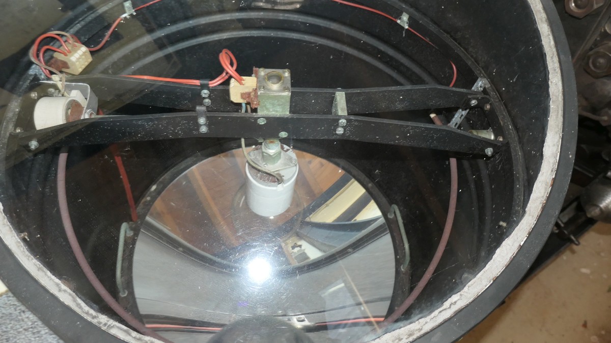 Spiegels. Der bogenförmige Heizstab diente zum Abschmelzen einer Schneedecke auf der Glasabdeckung und zur Verhinderung von Tauansatz. |