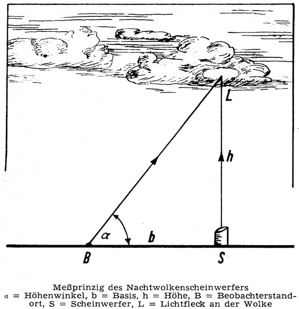 Nachtwolkenscheinwerfer von Pintsch-BAMAG Dieser Scheinwerfer diente nachts zur Bestimmung der Wolkenuntergrenze. Mit Hilfe eines Pendelquadranten wurde der Höhenwinkel zum Lichtfleck an der Wolke gemessen. Bei einer bekannten Entfernung zum Wolkenscheinwerfer (mind. 200-250m) konnte die Untergrenze der Wolke berechnet werden. ![]() Die Aufstellung des Scheinwerfers erfolgte auf einem Betonsockel mit einer Abweichung der Senkrechtstellung von weniger als 1°. Der erzeugte Lichtstrahl hat bei guter Justierung der Lampe einen Streuwinkel von max 2°. Dabei können Wolkenhöhen bis über 1000 m gemessen werden. |