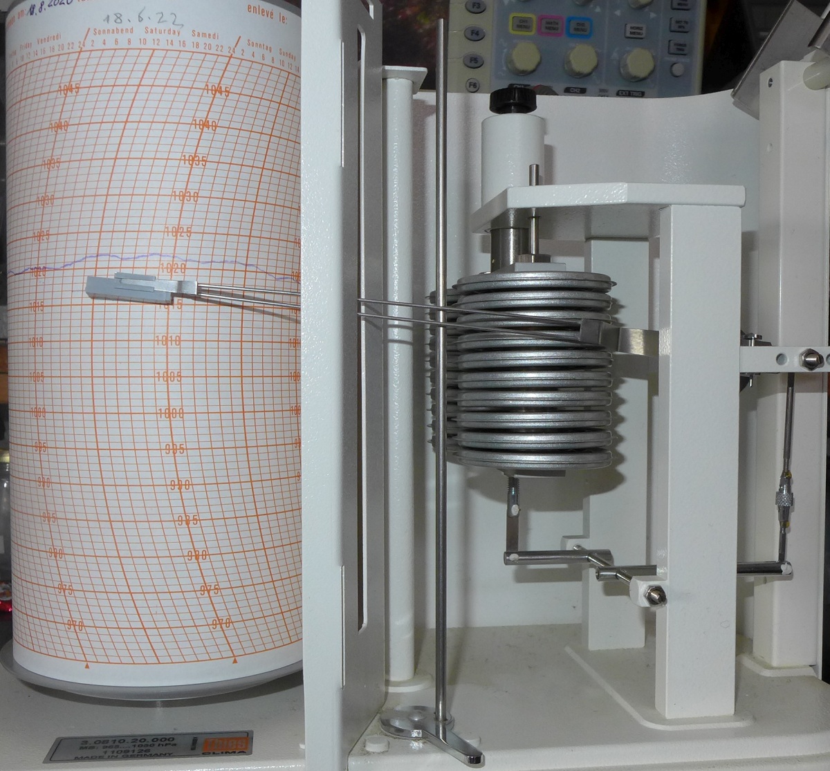 Thies Mikrobarograph 1065-1050 hPa Registrierbereich 85 hPa Schreibhöhe 160 mm 20 Vidie-Dosen, jeweils 10 parallel zur Erhöhung der Stellkraft. Dadurch können kleinste Luftdruckschwankungen (0,1 hPa) aufgezeichnet werden. Eine Silikondämpfung sorgt dafür, dass plötzliche Druckschwankungen z.B. durch Öffnen oder Schließen einer Tür nicht aufgezeichnet werden. |
