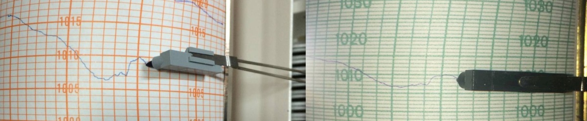 Auflösung der Registrierung vom gleichen Tag. Links der Mikrobarograph und rechts der kleine Barograph |