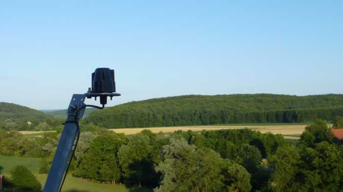 Links: Der alte Windmast (12 m Höhe) mit einem Fuess 90z Windmesser (ex DWD) Das analoge Anemometer diente früher bei Sturmwetterlagen zur Kontrollmessung und steht heute auf dem Dach. Unten: Das DAVIS-Anemometer, eine Kombination aus Thies Classic mit Reed-Relais und Eigenbau Windfahne. Das schwarze Davis Schalenkreuz läuft nur ohne Funktion. Bei schwachem Wind steht es häufig. Die Eigenbau-Windfahne hat durch die größere Fläche weit ab vom Drehpunkt zu einer deutlichen Verbesserung geführt. Beschreibung hier.