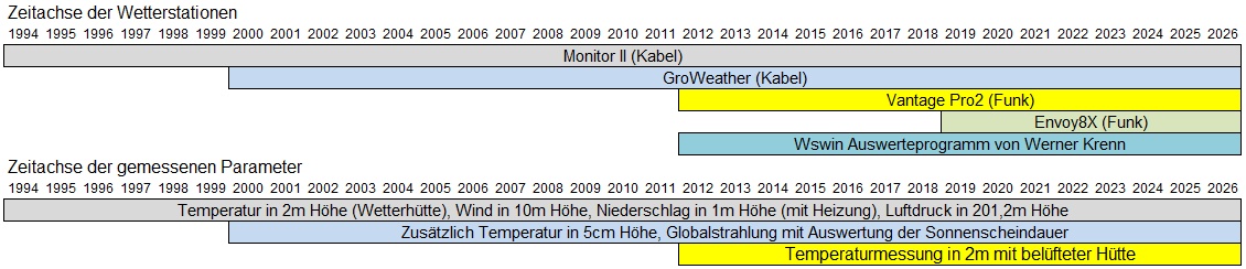 der Messdaten begann am 1. Januar 1994. (Niederschläge schon ab 22.04.1992) Jan 1994 bis Dez 1999 Davis Monitor II (Messintervall 30 min für Klimadaten) Jan 2000 bis September 2019 Davis GroWeather (Messintervall 10 min, für Klimadaten) ab 2012 Davis Vantage Pro2 im Parallelbetrieb (Messintervall 5 min, online) ab November 2019 zusätzliche Datenerfassung mit Davis Envoy8x. Die Online-Daten werden mit WsWin (von Werner Krenn) aufbereitet und im 10 min Intervall aktualisiert. Mit Ablauf des Jahres 2023 gibt es die erste 30-jährige Klimareihe für Temperatur und Niederschlag von diesem Standort. Bei der Klimastation in Bad Driburg handelt es sich um Geräte von DAVIS-Instruments (USA), Thies, Lambrecht und Eigenbau-Komponenten. (GroWeather und Monitor werden nicht mehr gebaut) Gemessen wird die Lufttemperatur in 2 m Höhe (Wetterhütte und parallel dazu belüftete Davis-Hütte), und 5 cm über dem Erdboden, Luftdruck (Umrechnung auf Meereshöhe), die relative Luftfeuchte, Niederschlagsmenge (Intensität und Dauer), Windrichtung und Geschwindigkeit (Mittel und Max Bö) sowie die Globalstrahlung ab 2000. Das Messintervall beträgt aktuell 5 Minuten.